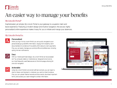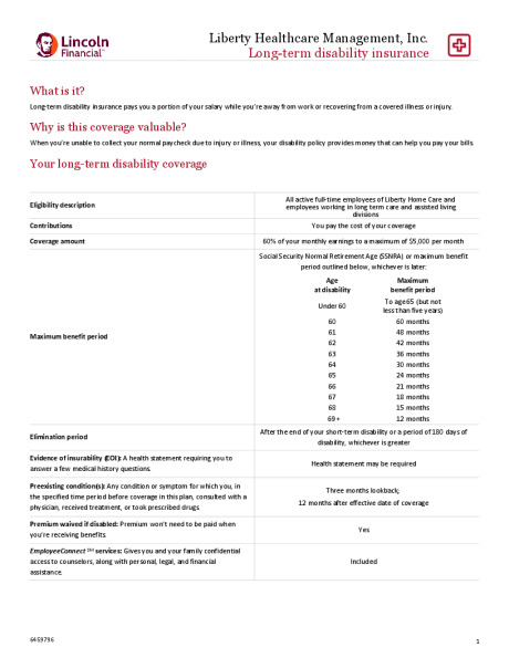 Long-term disability is a benefit that provides partial income protection if a serious illness or injury causes you to be on medical leave of absence from work for more than 6 months. During this time, you will receive 60% of your monthly income up to $5,000. This benefit is offered through Lincoln Financial.