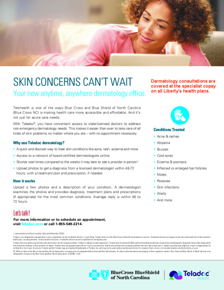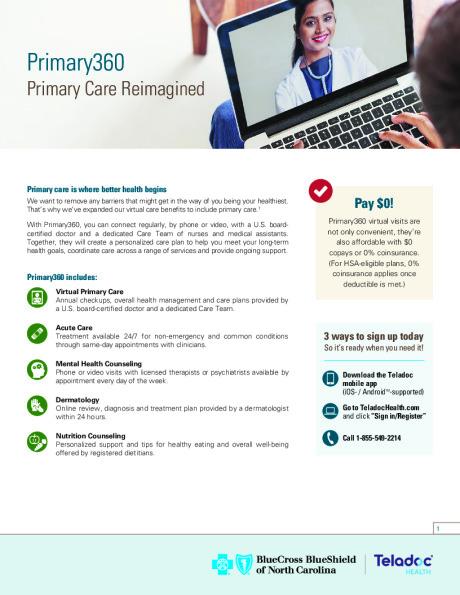 BCBSNC is expanding their telehealth services through Teladoc Health with Primary360*. With Primary360, members can connect regularly, by phone or video, with a U.S. board certified doctor and a dedicated Care Team of nurses and medical assistants. Together, they will create a personalized care plan to help you meet your long-term health goals, coordinate care across a range of services and provide ongoing support.